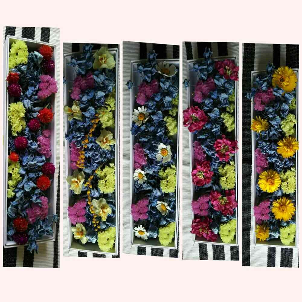 同じベース(青の紫陽花、スターチス黄色、ピンク)に色々合わせてみた🎵