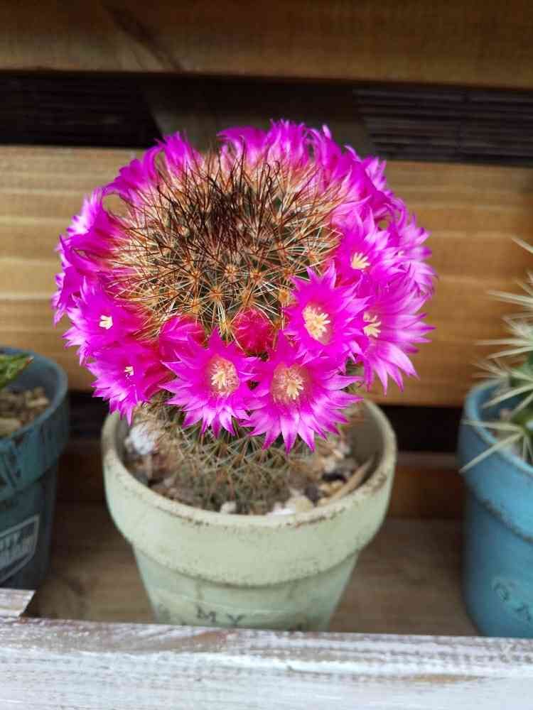 何年か前に買って放ったらかしだったサボテン、多肉棚に並べるようになって少し大きくなったので、春に植え替えてあげたら、こんなに綺麗な花が咲きました。🥰