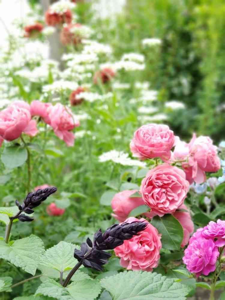 新緑にダヴィンチさんとチャリオットさんのうっとりな光景に、こちらのサルビアさんのアクセントとても素敵です🌹💚✨💜✨