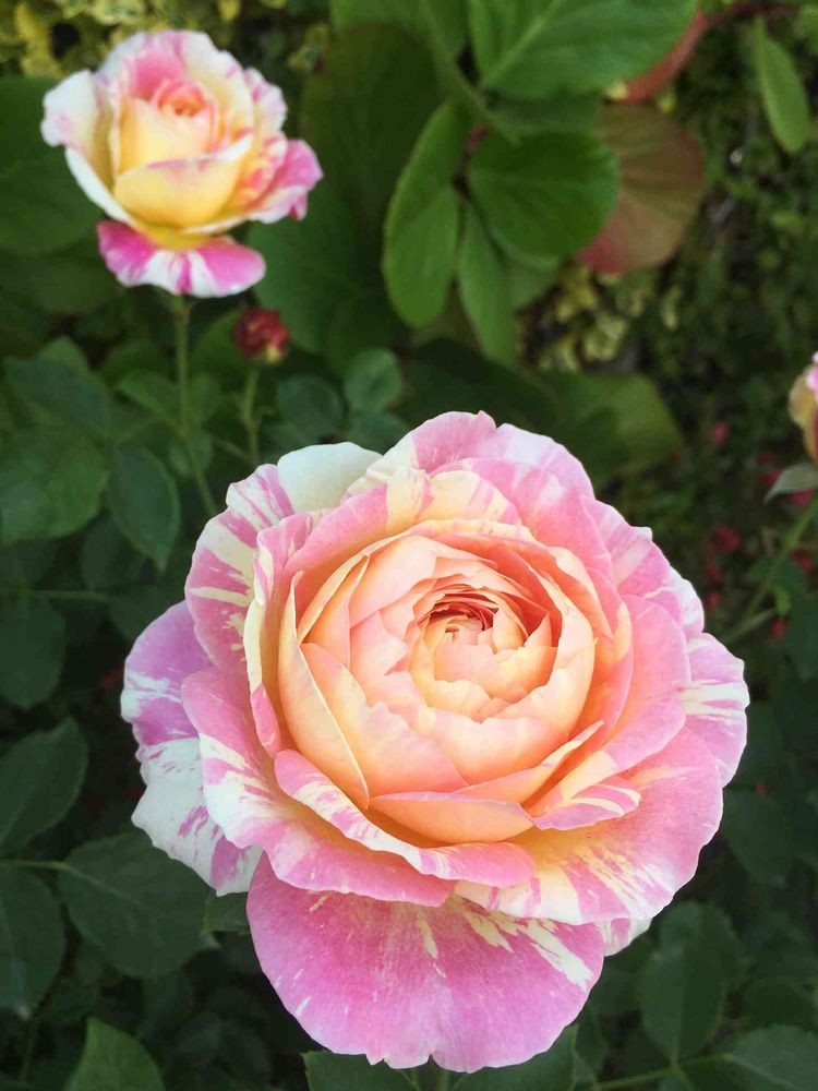 ピンクに淡いオレンジイエローの絞りが入るロゼット咲きの中大輪花💖独特の華やかさと愛らしさがあります🤗