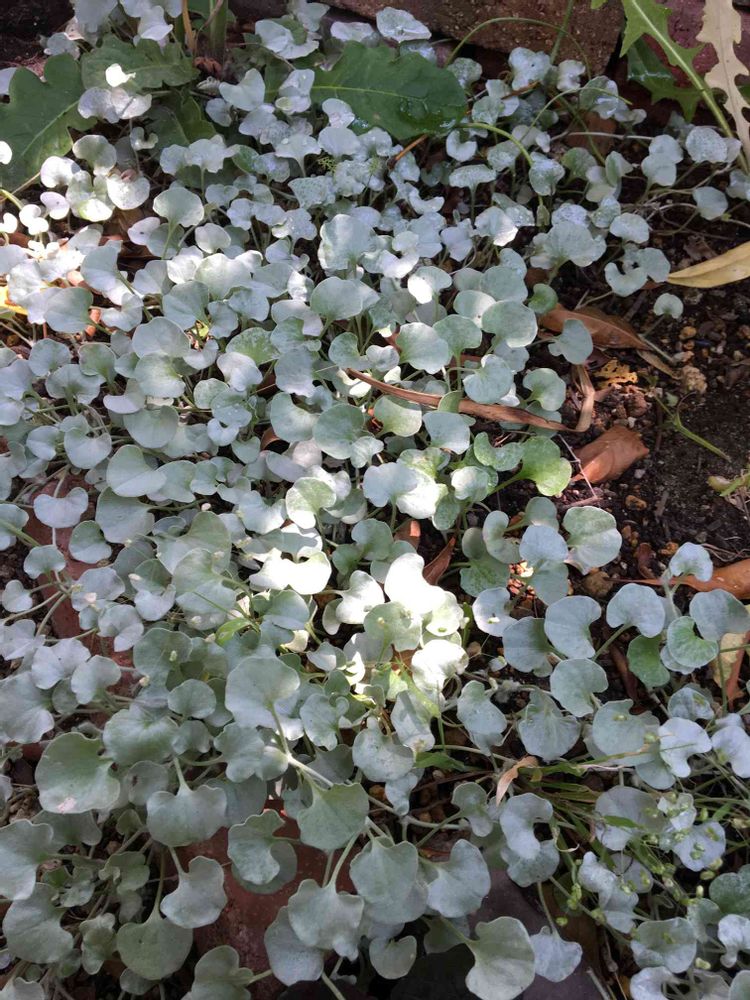 シルバーのディコンドラがシマトネリコの木の下で広がっています。冬は枯れそうで枯れない程度でしたが今の時期は元気です。寄せ植えにつかいたいけど、なかなか上手く使えないんですよね〜💦