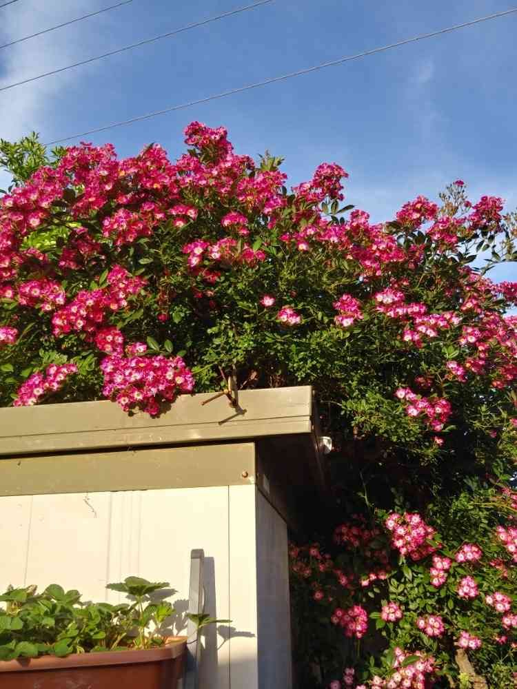 枝を上に伸ばし物置きの屋根に🗜️を着けて紐でくくりました
