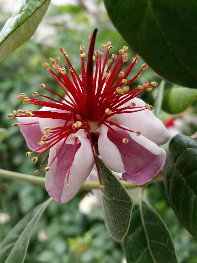 フェイジョア咲いてます😁花弁も、実も美味しいですが、一本なので実はいつも2.3個です💦😅ヒヨドリが花びら食べるので、その時受粉するのでしょうか✨