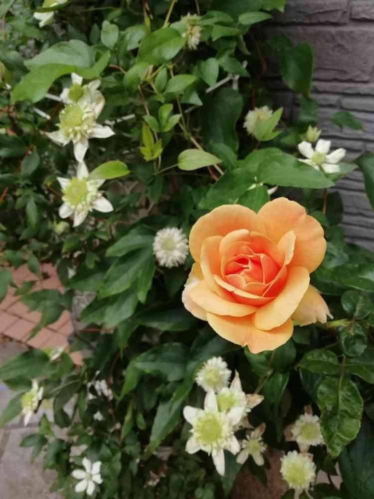 激安接ぎ木苗のツルロイヤルサンセット二つ目開花。なんだいなんだい、クレマチスシロマンエとめちゃくちゃお似合いじゃないか✨