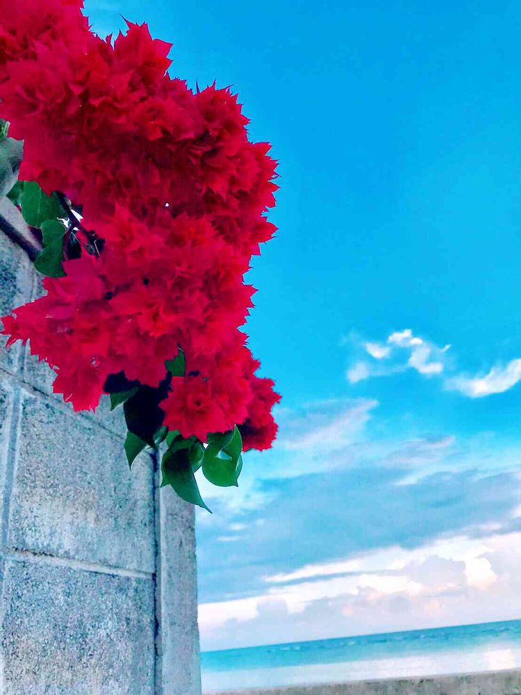 真っ青な海と空、真っ白の雲、色鮮やかなブーゲンビリア♥️