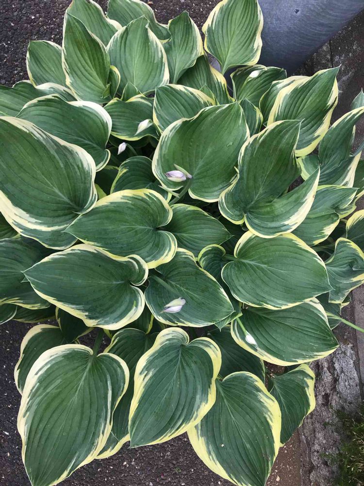 ギボシ が花をつけたのですが、あまりに葉が大きくて花が分かりづらいですね 口径60cmの鉢がまったく見えません
