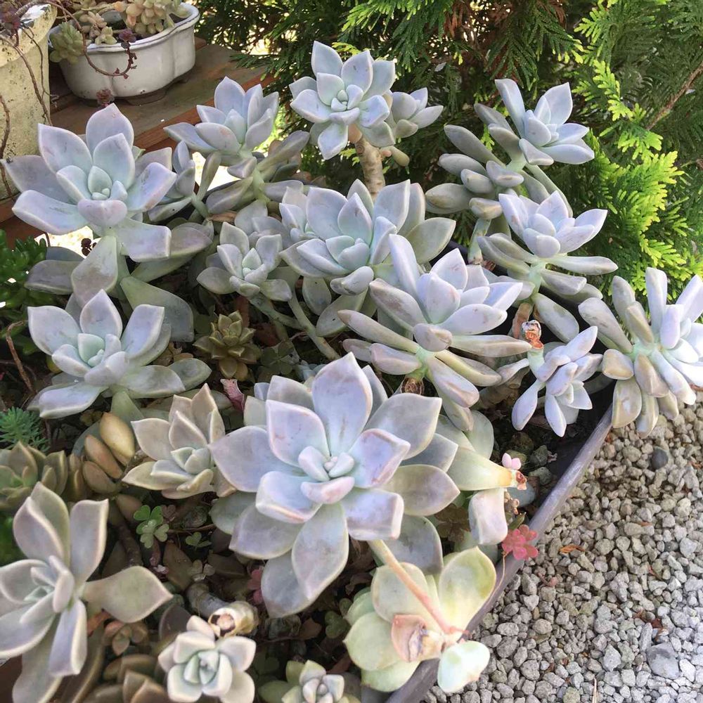 完全な雨晒しなのでこれからの季節、ウチはカタツムリが天敵です。黄色に近い緑色の多肉がよく食べられてしまいます😞