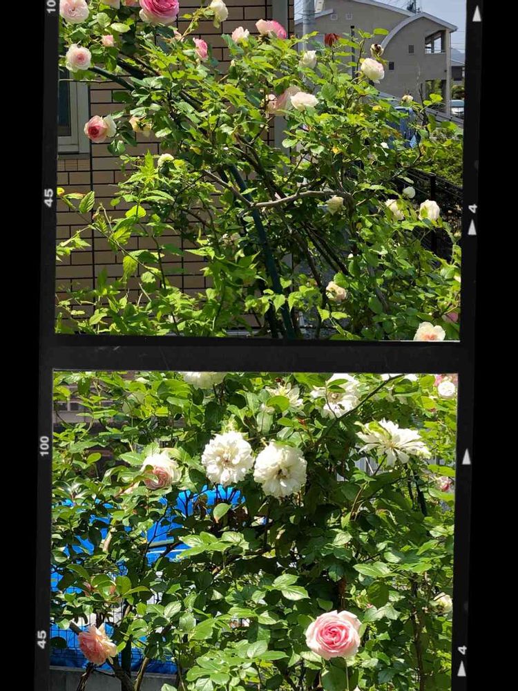 下…ピエールが1本 クレマチス ダッチェス オブ エジンバラ がすごくてバラがほとんど見えない😵😆🎶💖見えるのは 後ろのお宅のブルーシート😱