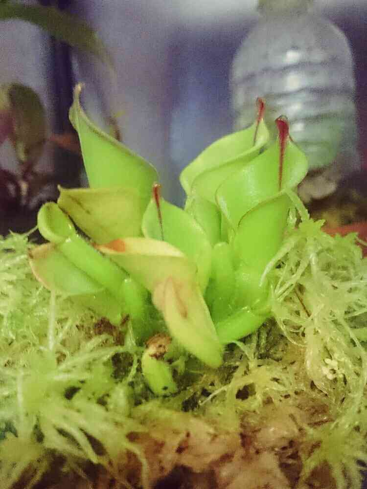株分け後ペットボトル温室+水苔で育てているヘリアンフォラミノール