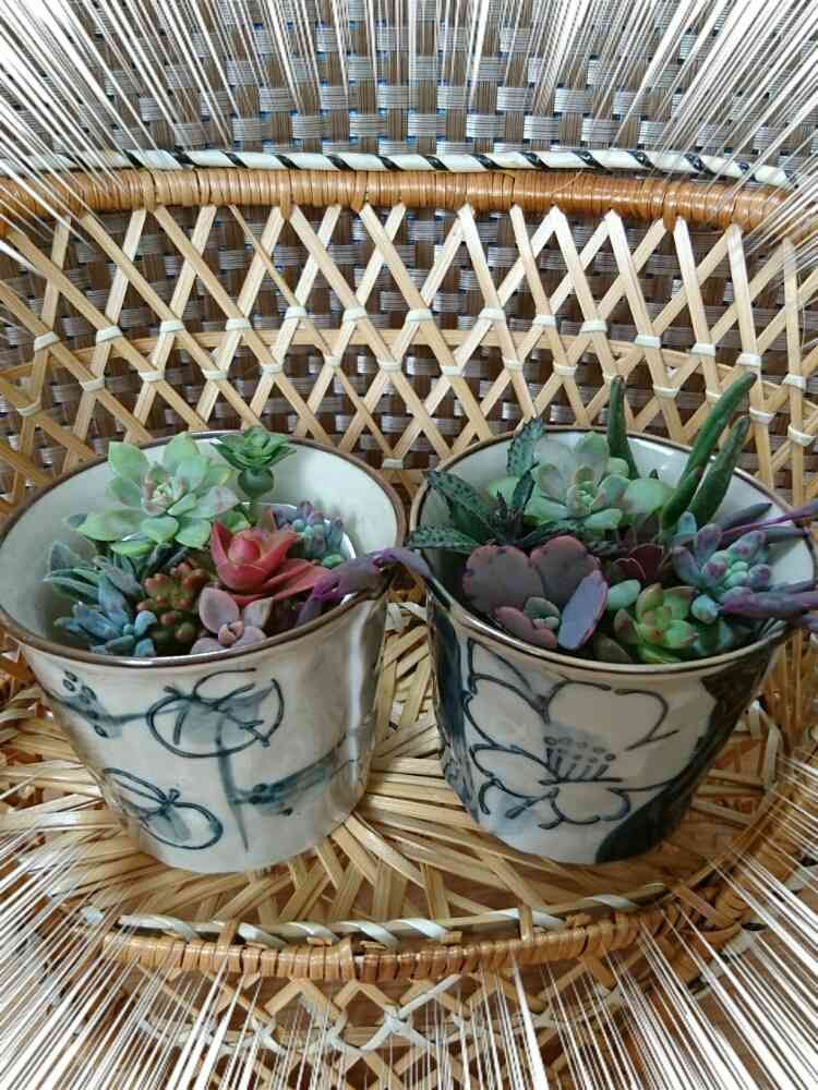 苗が入ってたポットに寄せ植えして、湯呑みに入れてます😄