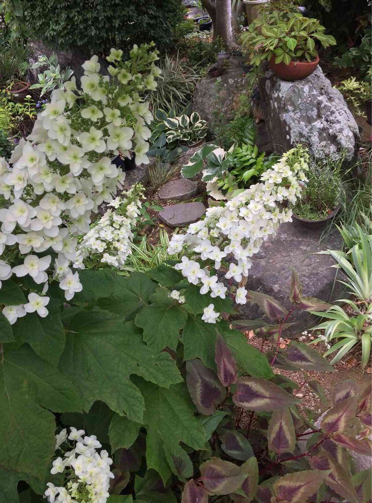 カシワバアジサイの花後の剪定は7月下旬迄に、花の2節下を切り取ると、下の葉の根元から新芽が出て枝になり、その先端に花芽が出来るそうです。
