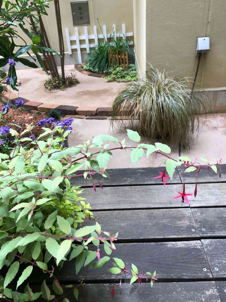 フクシアの寄せ植え、職場の中庭で楽しんでます🎶