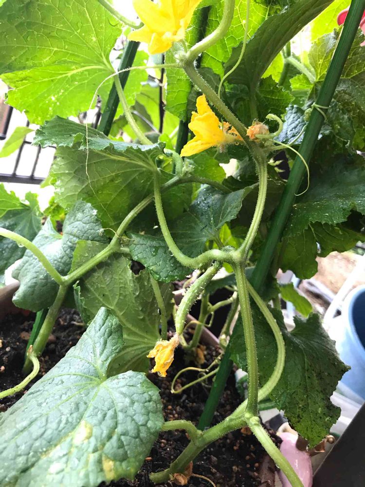 先月おチビだったきゅうりの苗が今はツルをくるくる支柱がなければ倒れちゃう背高ノッポさんに成長しました🥒黄色い花に実がついていっちょまえです😊🥒👏