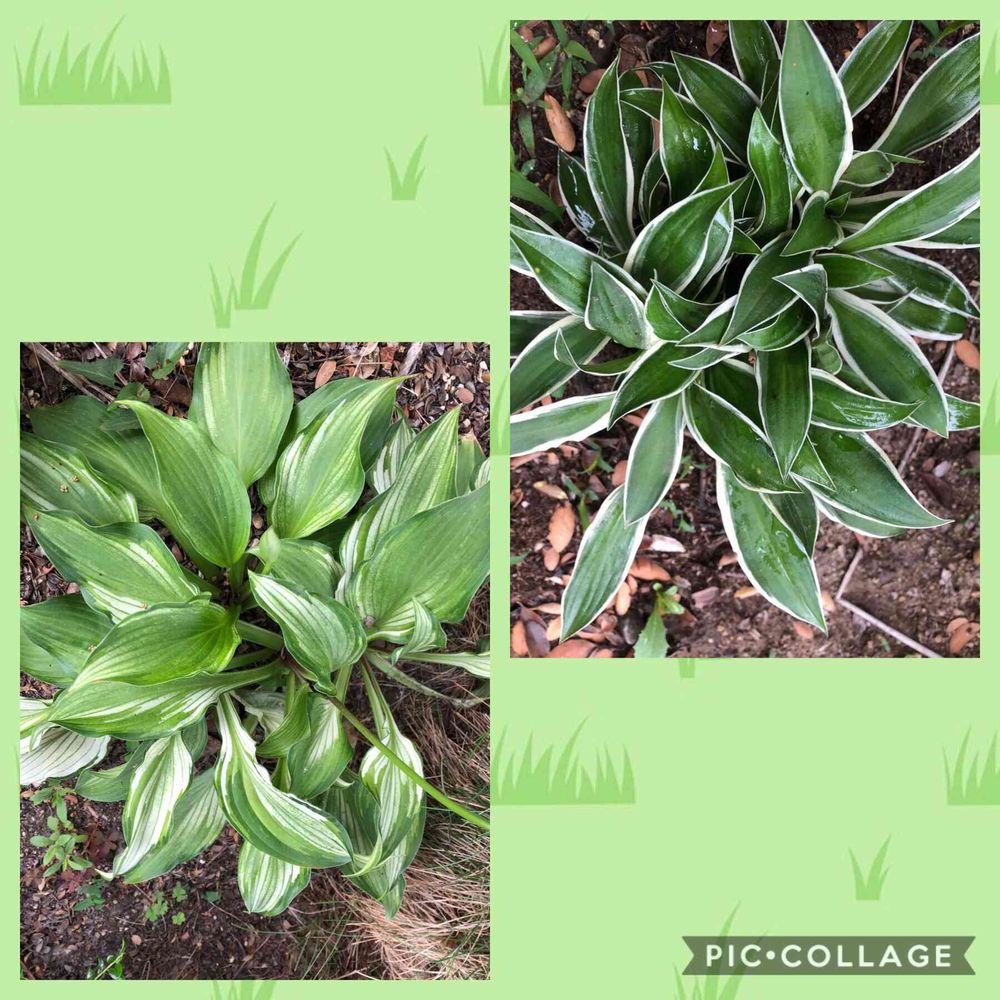下が斑入りギボウシですね。💚🎶右上はオモト(万年青)かと思います。