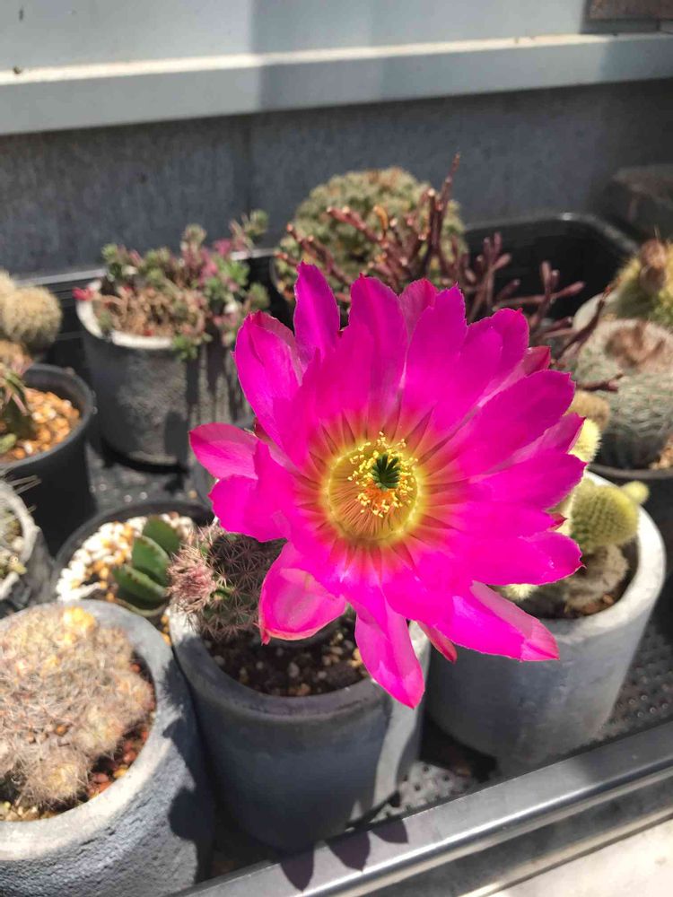 桃太郎に続き皇女エビ echinocereus bristolii も咲きました(^◇^)花弁、雄しべ雌しべすべてスゴイネオンカラーです。