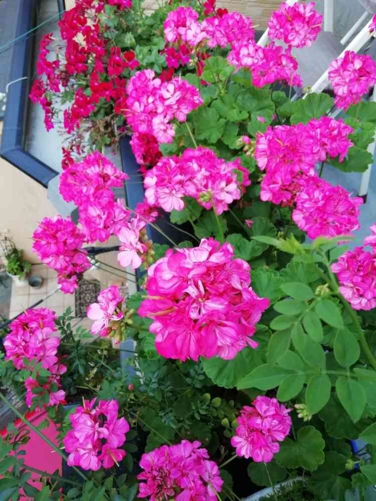 ミニツルバラ雪明かりのある北側ベランダ、向かって左側の狂い咲きゼラニウム。奥の赤み強いピンクはアイビーゼラニウム。下からだとちょっとしか見えないけどこんな凄いことになってますw