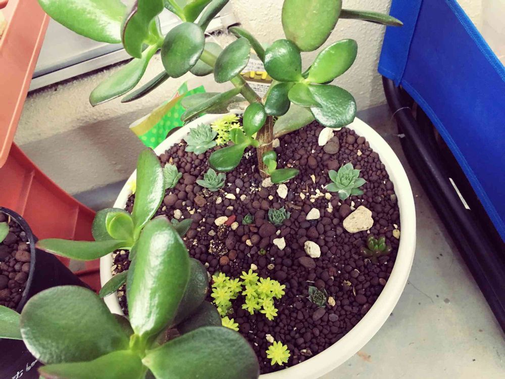 カネノナルキの鉢が大きかったので、葉が落ちてしまった子や、窮屈になってる子の子株分けでできた子、風とうしのために引っこ抜いた子達を植えて寄せ植えにしてみました!(っ´・ω・)っぎゅー
