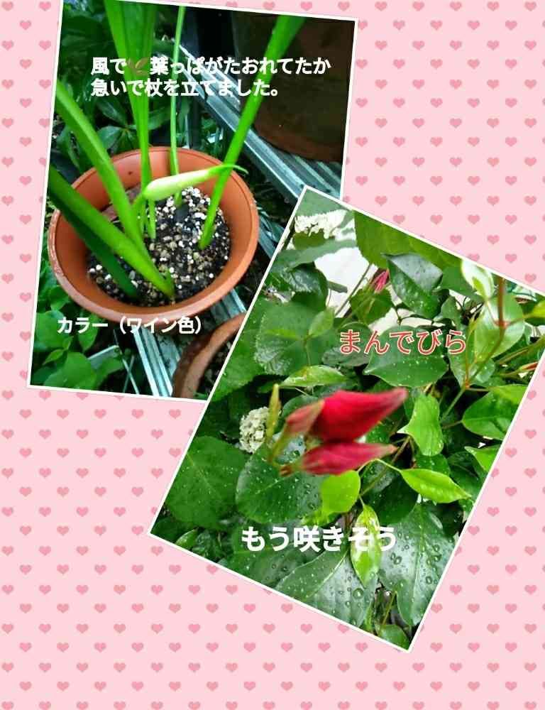 去年、咲かなかったカラーが今年は1つ花芽がついたのに雨風で葉っぱが倒れてたから、まだ咲かないうちに
