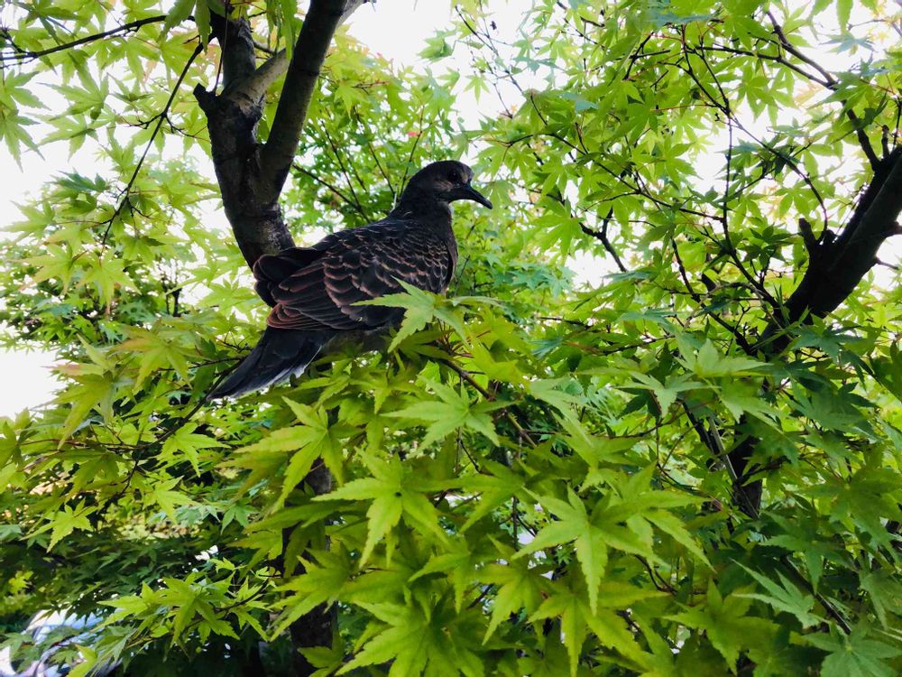 まず最初の1匹はお昼前に2匹目は夕方に、この画像は薔薇の木からすぐ隣の紅葉の木に飛び立った所です。💕🕊
