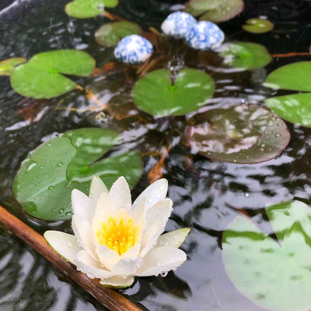 雨の中、メダカ池の睡蓮が花を咲かせてました