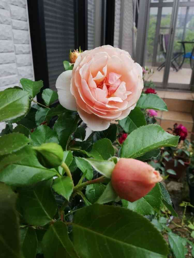 四季咲きのケルビーノ 2番花が開き始めた日が梅雨入りとは…☔ 今日は1日中、軒下に避難でした