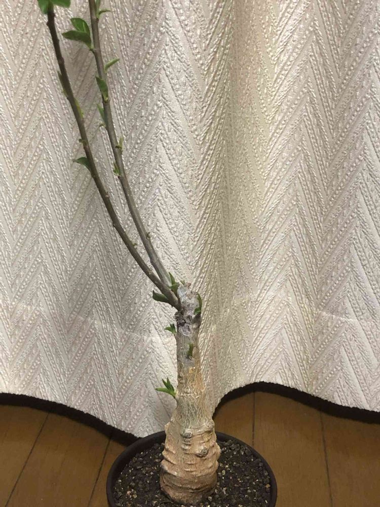 5年物のバオバブですが、剪定された所からの新芽以外の所から初めて葉っぱが出てきました。