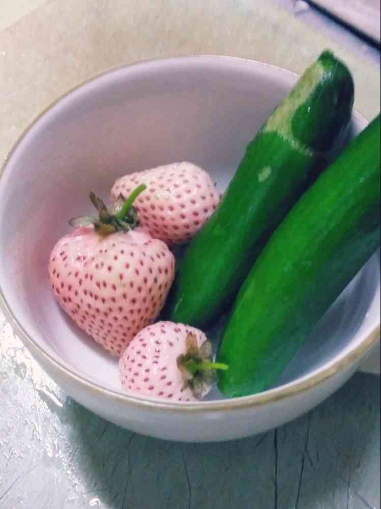 やっと白苺収穫し食べてみましたまだはやかったのか、酸っぱさが強く今一つです。口直しにミニキュウリが役立ちました。