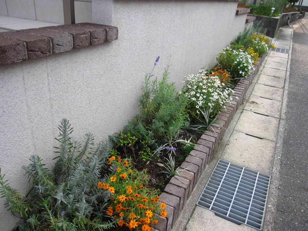 玄関前、北の花壇です。ジニアとラベンダ-で賑やかになっています。