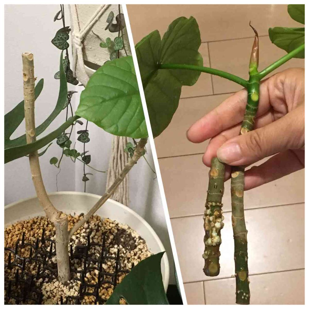 先月末に剪定したひょろひょろウンベラータちゃん、ついに芽と根が出てきました‼️