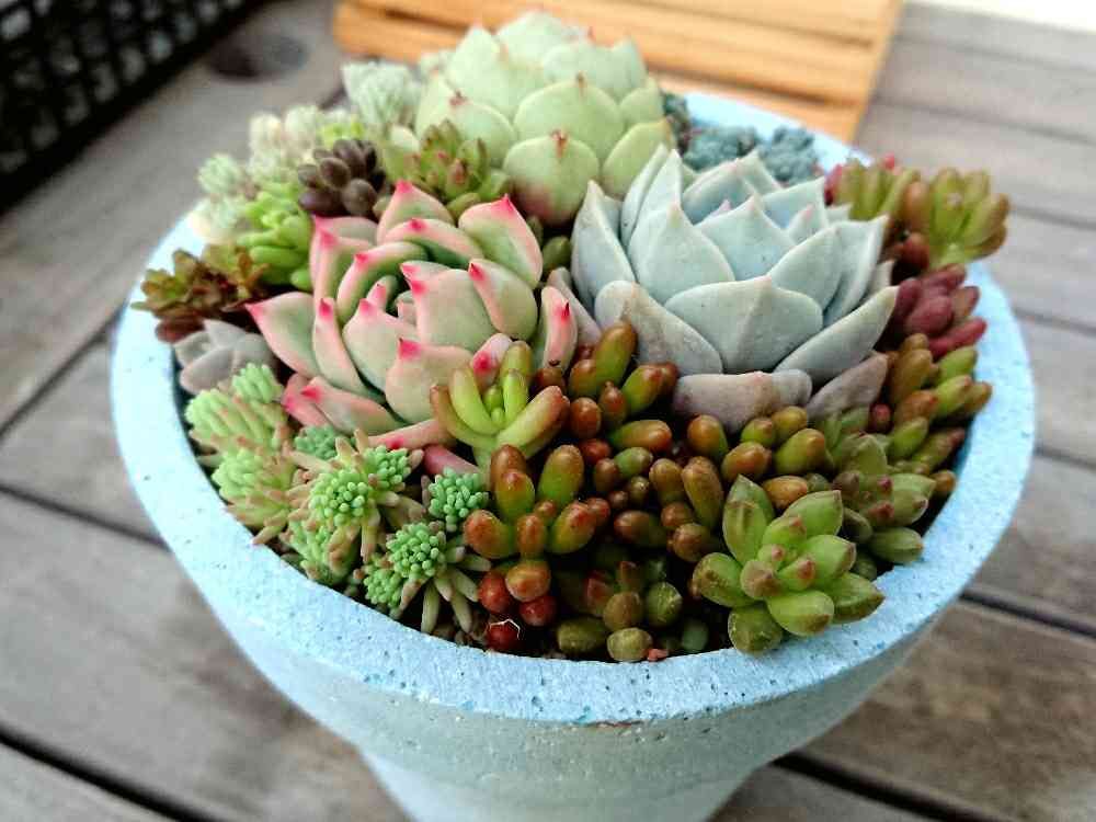 たいしたコツではありませんが、メインになるエケベリア以外にセダムを数種類多めに用意しとくと隙間を埋めるのに重宝しますね。余ったセダムは次の寄せ植えにも使えますしね。エケベリアもピンポン玉みたいにコロンとした形のほうが出来映えがまとまりますよ。頑張って寄せ植えしてみて下さいね。