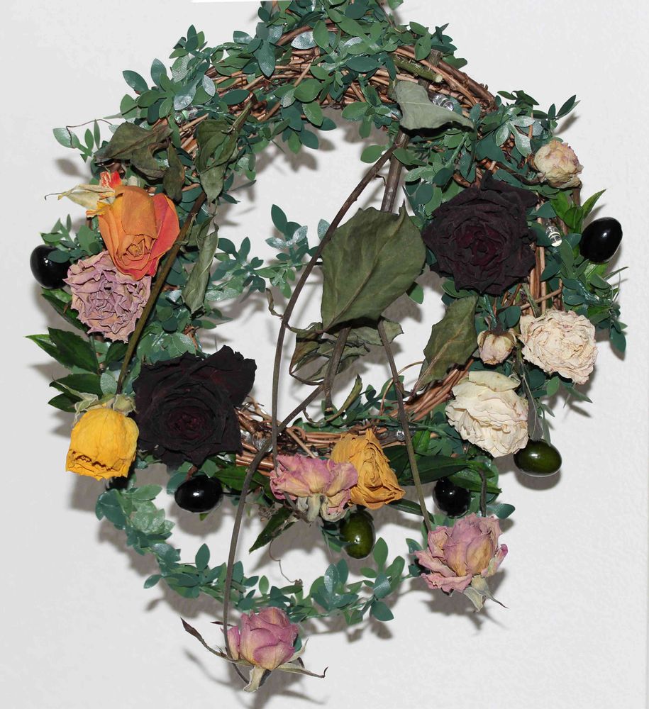 100均で買ったリース素材を組み合わせて、ドライフラワーにしたバラたちを付け足しながら作ってます。(進行中)