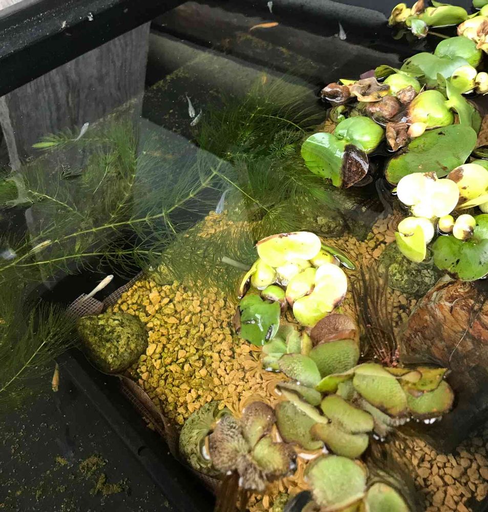 ホテイアオイは、だんだん元気なくなって来たし、手前の水草も茶色っぽくなって行くし、😭メダカちゃんの赤ちゃん死んじゃうし...どうして?誰か教えてー!