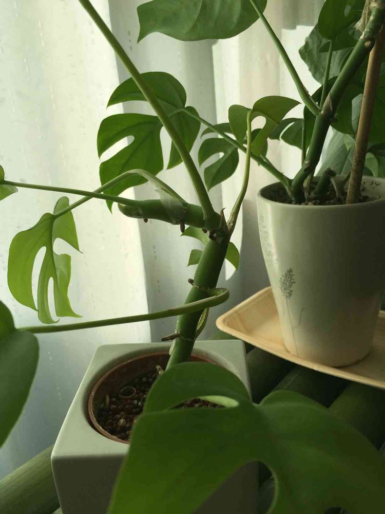 ヒメモンステラ日光浴中です。ハイドロに挿してから、なぜかカクッと直角に曲がりました🤔この際なので垂れ下がり仕立てにします。レンジフードの上からふわーっと垂れ下がってくれると嬉しいな😊 後ろの鉢は親株、超元気です。