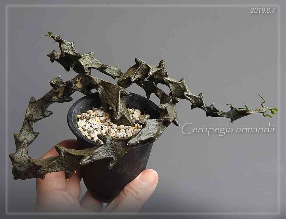 セロペギア、アルマンディ。去年の同じ時期は、右向きに伸びている一枝くらいの大きさだったのに、一年でぐるりととぐろを巻くほど伸びました。今期はどれほど大きくなってくれるか楽しみ。