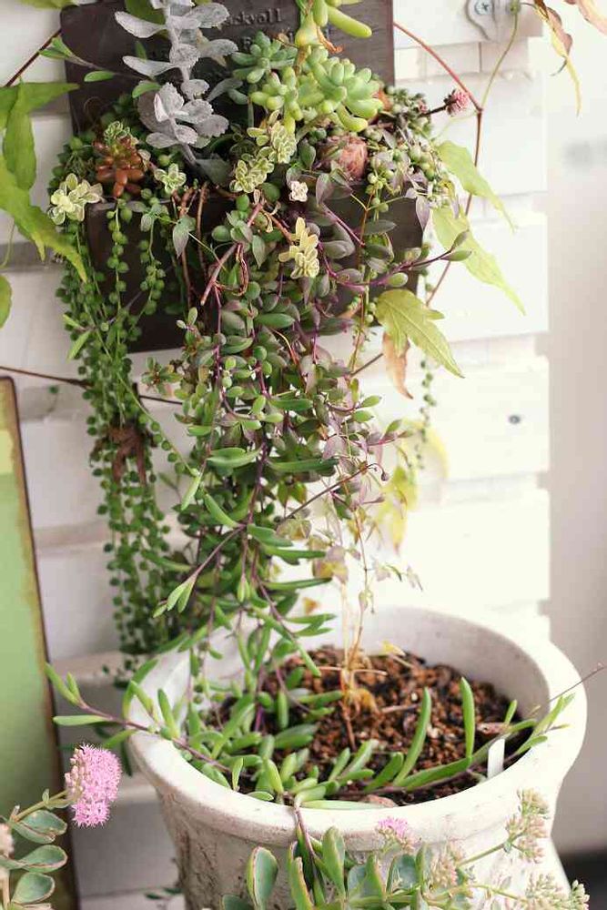 暴れ多肉さんから垂れたグリネが、下にあるクレマチス マリアコーネリアの鉢に着陸し、根付いています💦