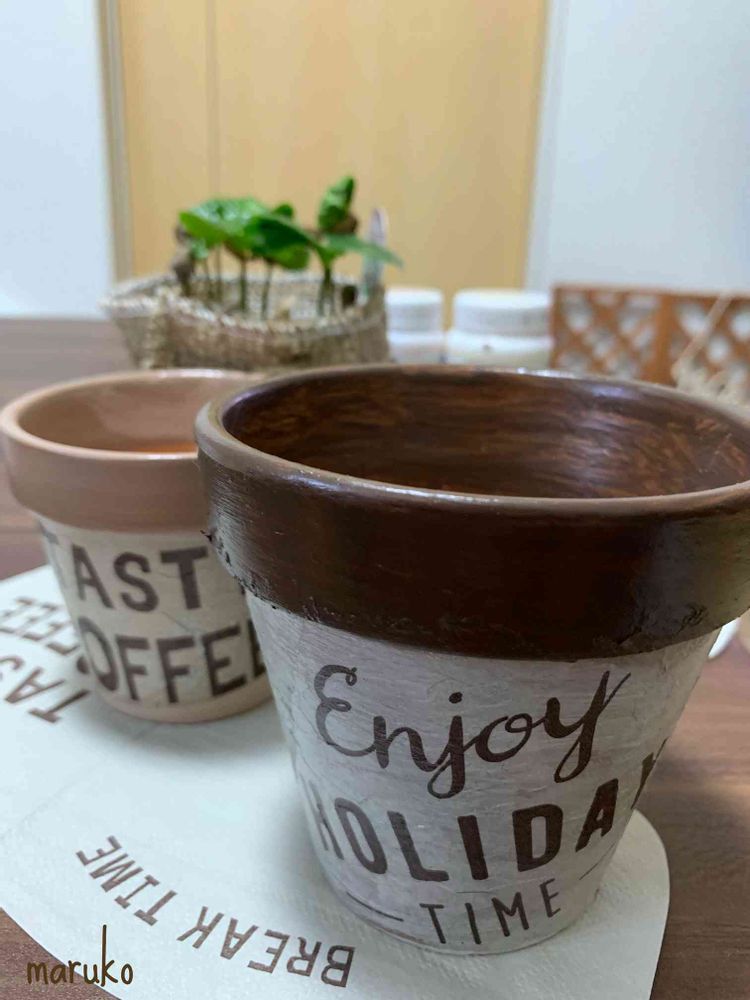 後ろにあるコーヒー豆の木用にとそれに似合ったペーパーナプキンを使い(下に敷いてある物です)鉢の上部はmilk paint !今回の材料も全てダイソーです😉