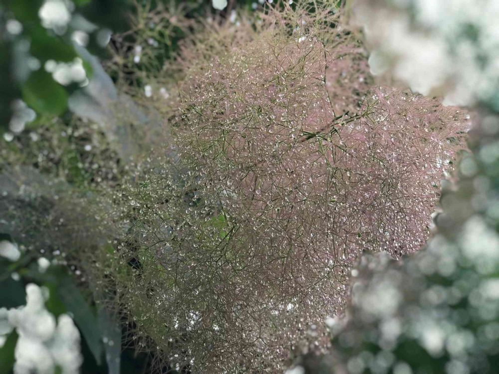 神社のスモークツリーに綺麗な水滴が…。