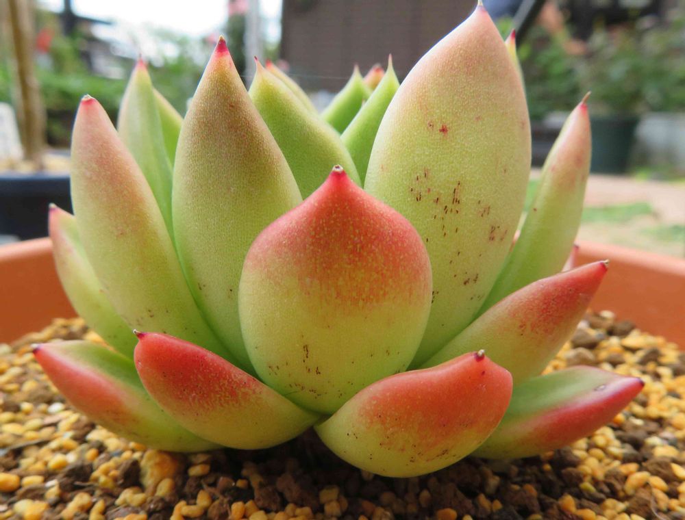 1年半前の冬にすべての葉の表面に細かい黒い斑点が出て枯れるかと思ったシャイニングパール。なんとか生き延びて1年後にはすべての葉が入れ替わるほどに成長した。この時期の下葉の色合いがリンゴのようで目を引く。