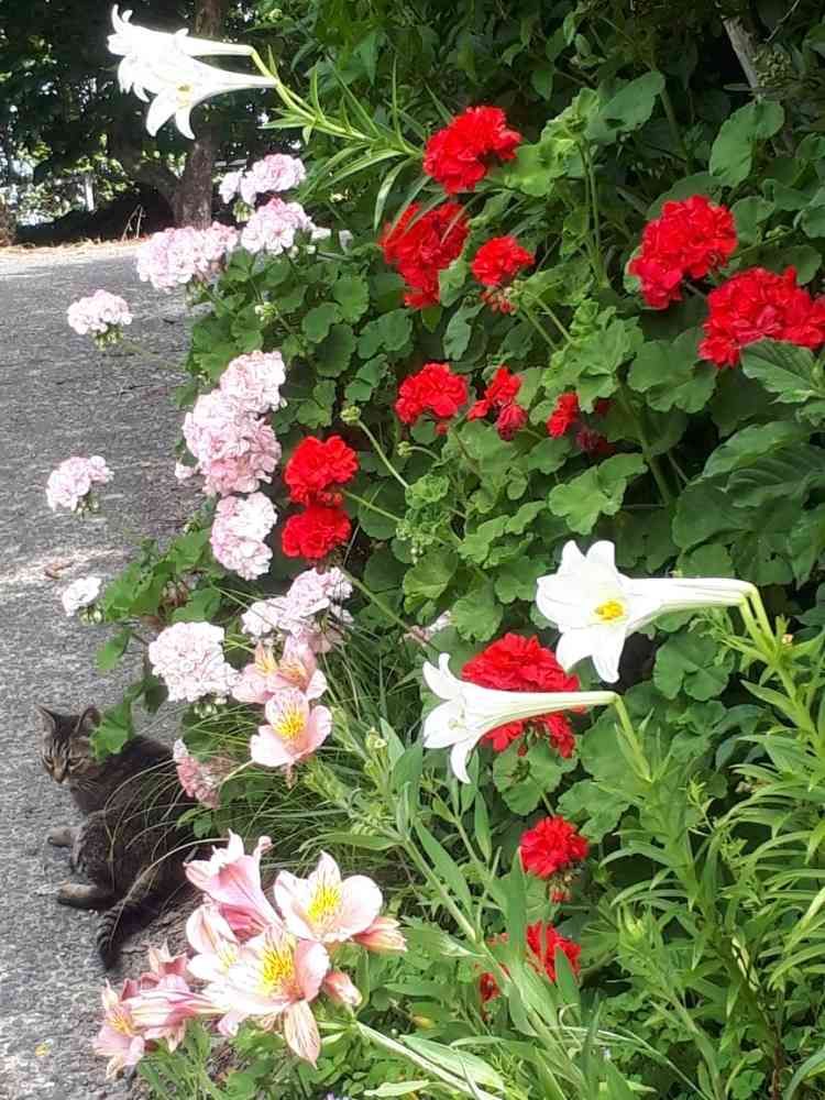 ここは小道に面した場所でゼラニウムは適当に挿し木して百合は勝手に生えててアルストロメリアも植えた記憶がないという😅ほとんど自然です😆