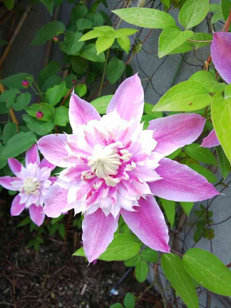 クレマチス大好きで、八重咲きは本当に華やかです❗️玄関横が明るくなります🎵