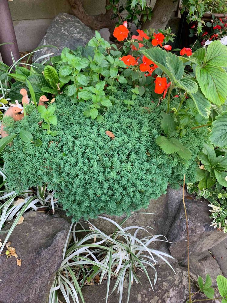 花諸々の寄せ植え鉢に落ちたセダムの葉が気付けばすごいことに😂