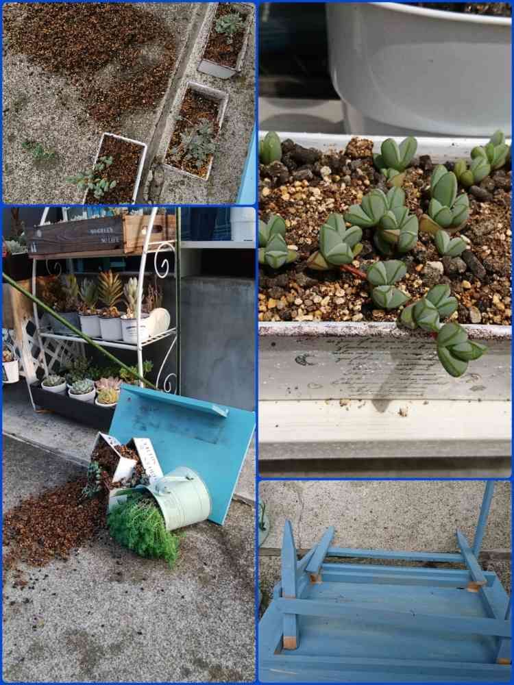 幸い、上に乗せてたトトさん、子持ち蓮華と錦さん、お父さんが発見したときは左下↙️のような状態だったらしく、土が大量にこぼれただけで無事でした❤