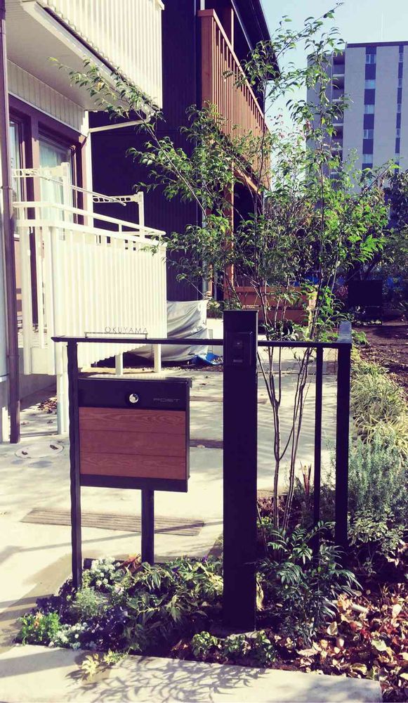 ポスト、インターフォン、アイアン手すり、ブラックで統一。