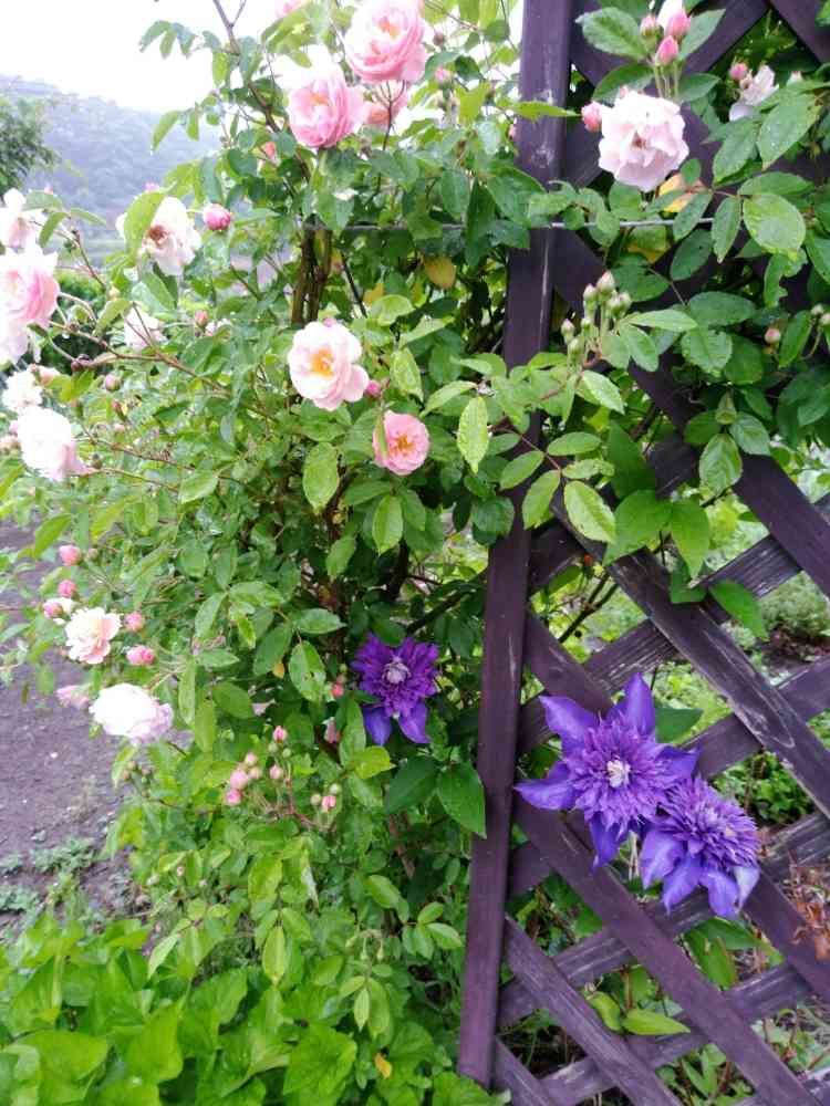 バラのピンクとクレマチスの紫の組み合わせが素敵😍✨✨