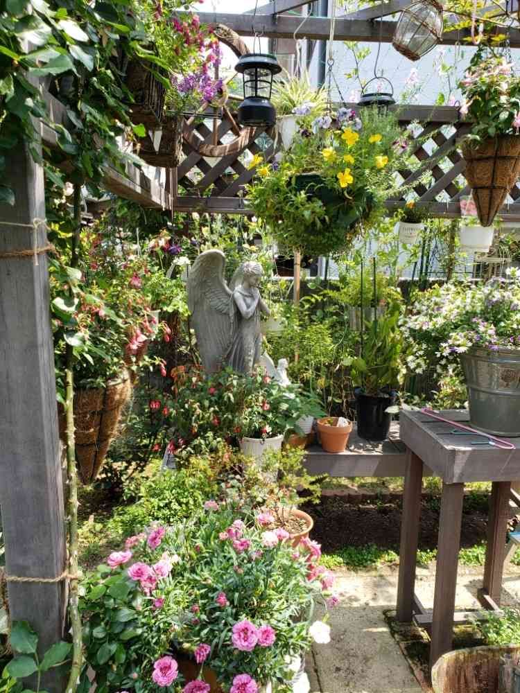 「祈りの天使」の右上斜めにある大きなハンギング・バスケットには、パンジーがまだ、頑張って咲いているので、抜くに抜けない状態です。