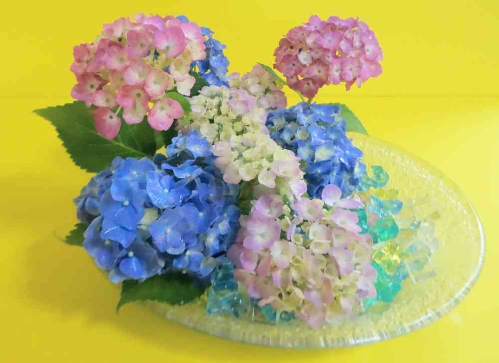 アジサイ色とりどりで作品を作りましたが何本のアジサイをつかっているでしょう