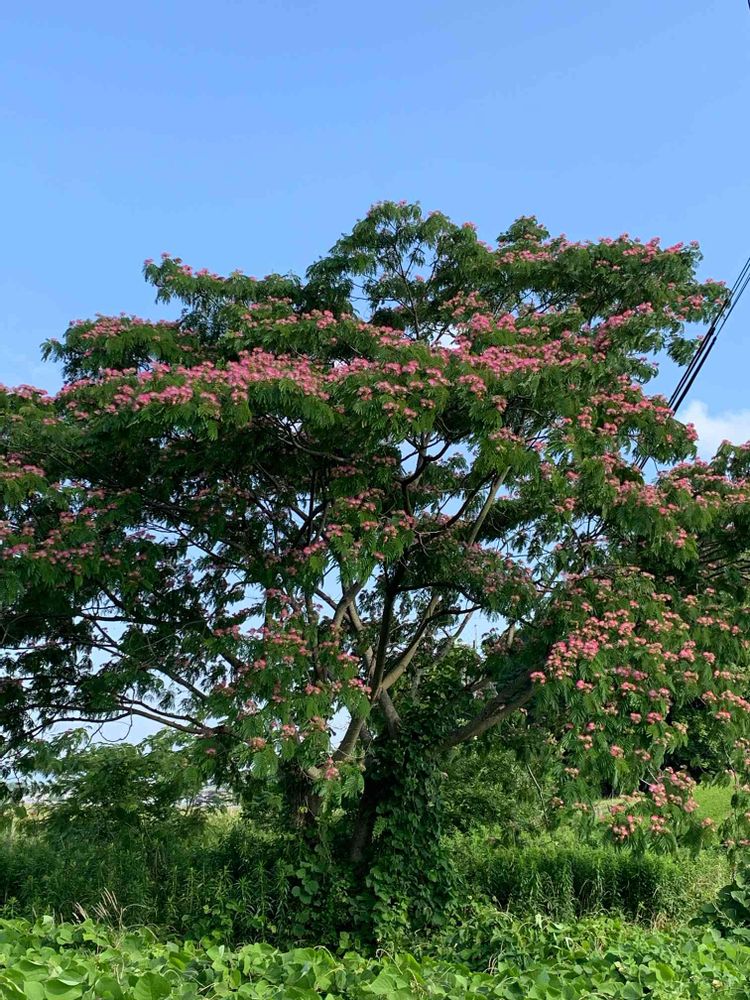 朝のウォーキングコースの梨畑にあるネムノキ。それはそれは立派な大木で、毎年この時期に一斉に咲き始めます。もう10年以上見てるかも、、1年ってあっと言う間😆