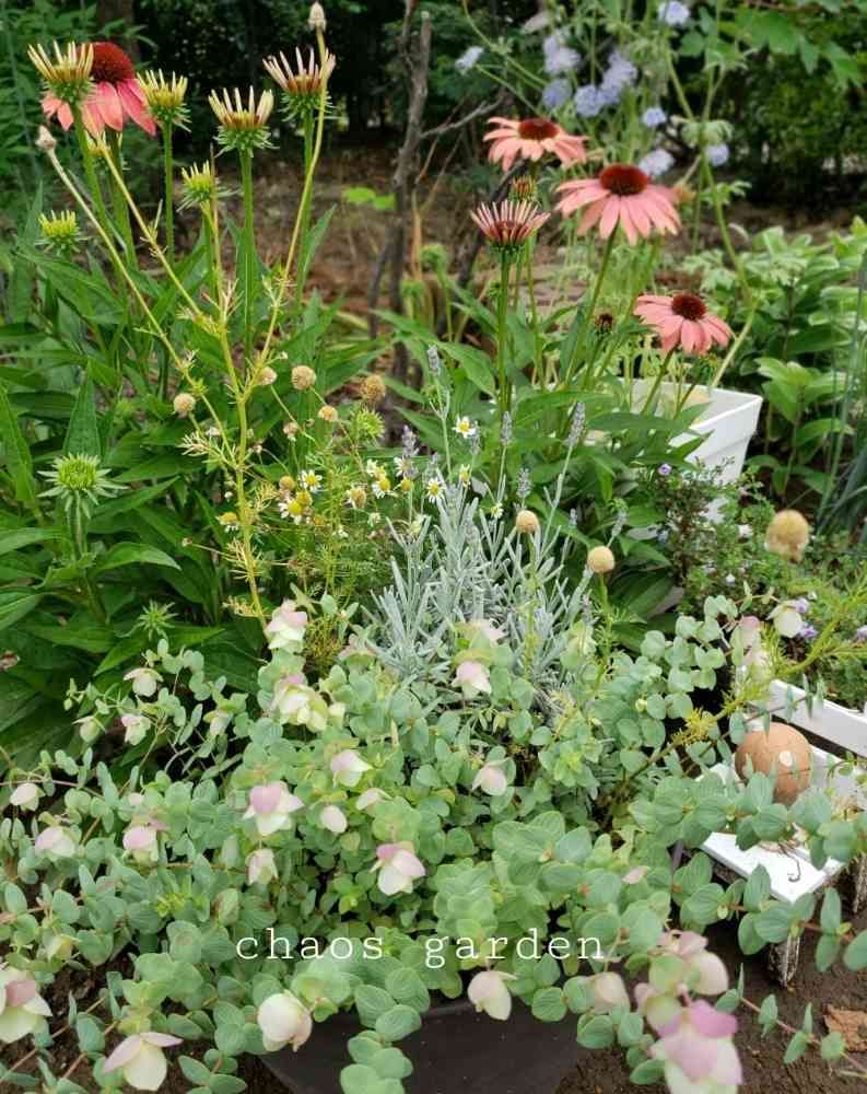 オレガノとカモミールとラベンダーのハーブ🌿鉢も花壇に置いてみました。