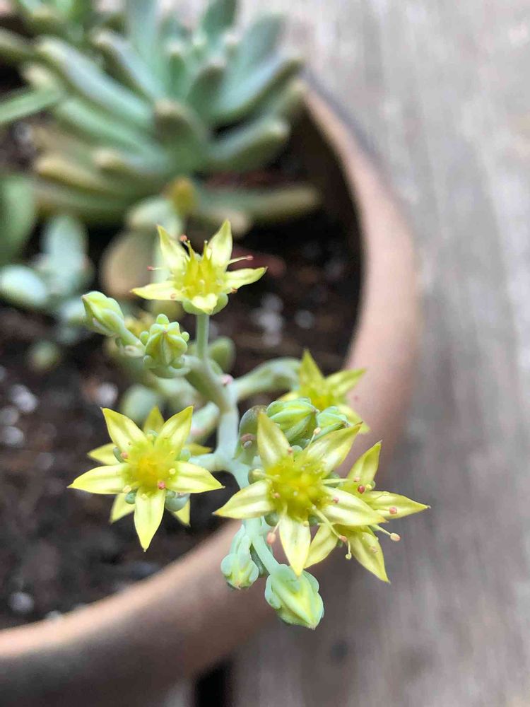 多肉ちゃんの茎から黄色くて小さいお花が咲きました。先端はピンクで超可愛い💕