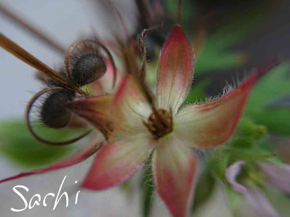 マクロレンズで「アメリカフウロ」を見たら、花と黒い種子と、この赤い花のような物⁉️